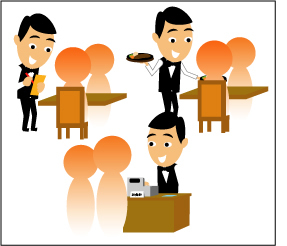 ■店の従業員がお客様の注文を聞き、伝票に記入して商品を提供する。会計時に伝票を確認し、従業員が直接お金を受け取り、レジで精算する。